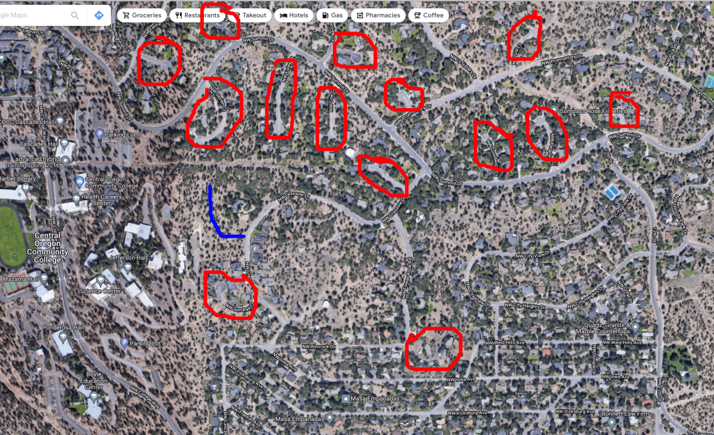 The story of Awbrey Butte development starts a while back – but not that far back, either. I’ve talked with people who remember riding mountain bikes on the trails up there. This USGS Topographic Map is from 1981 and shows some roads being penciled in, but there were no homes, only Central Oregon Community College. Every single home there was built on formerly open land where people walked, deer grazed, and trees grew. All these spaces were lost when their homes, and the wide roads leading to them were built.